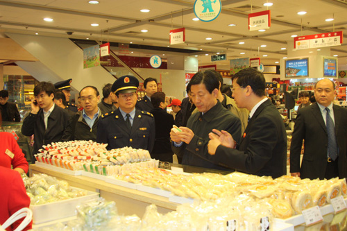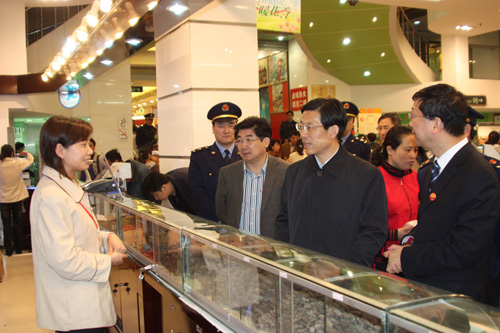 4月22日上午,国家工商行政管理总局副局长王东峰一行在上海市工商局领导的陪同下,来到第一食品连锁视察。
